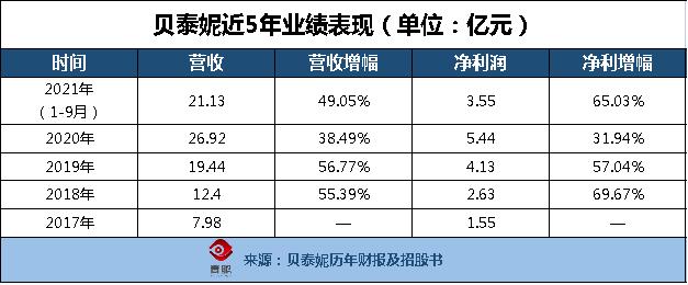财报显示,贝泰妮在今年前三季度的营收(21.13亿元)已超过其在2019年全年的营收(19.44亿元)。