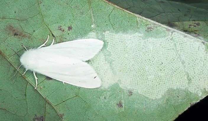 在叶子下大量产卵的成年美国白蛾。| Bugwood.org.