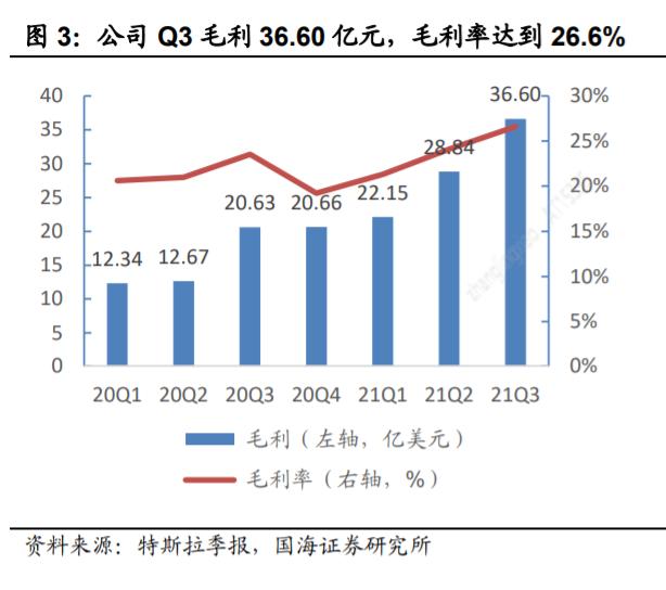 特斯拉一路走高的毛利率,已经远超其他车企。第三季度财报显示,特斯拉第三季度营收同比增长57%达到137.57亿美元,净利润为16.18亿美元,是去年同期的近四倍。第三季度,特斯拉交付量241300辆超过生产量237823辆,交付速度超过生产速度。