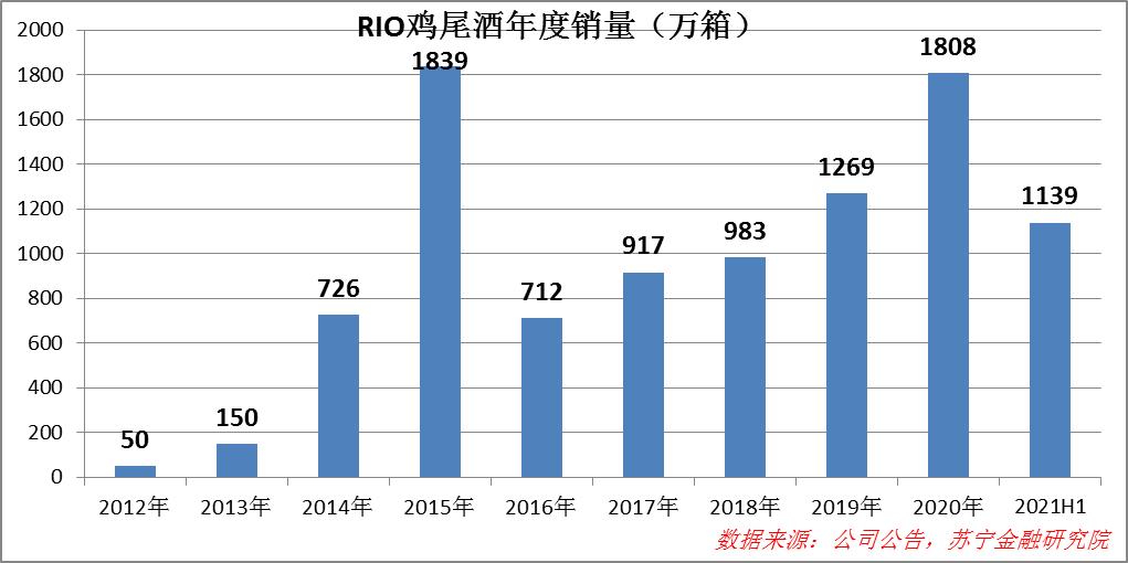 近年来,RIO鸡尾酒年销量数据与行业走势并无二致,2012-2015年处于爆发式增长阶段,2016年出现断崖式调整,之后逐年恢复,2020年才勉强恢复至2015年水平。