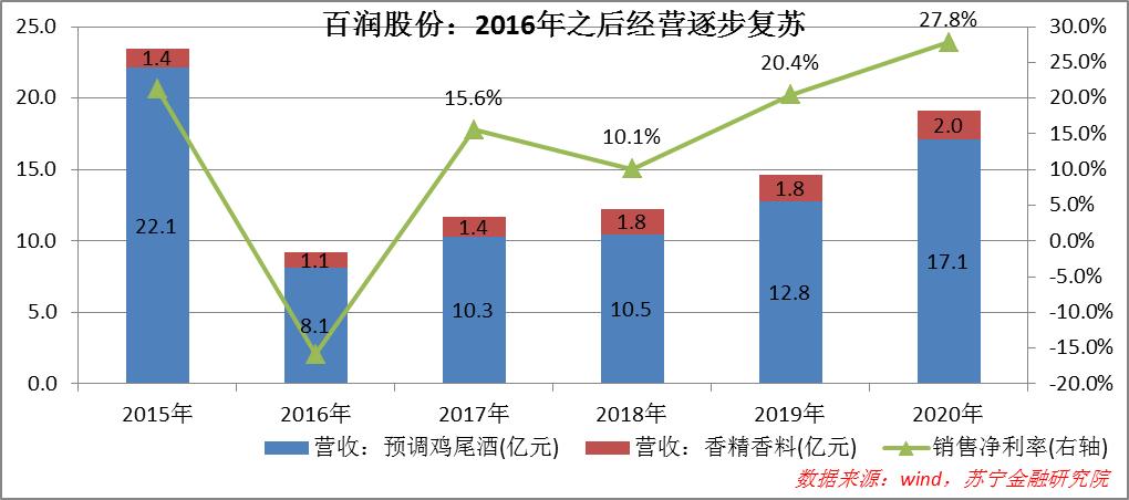 2016年,受预调鸡尾酒业务大幅调整影响,百润股份经营业绩变脸,营收同比下降61%,净利润从盈利5亿变成亏损1.47亿。自2016年之后,随着预调鸡尾酒业务的逐步回升,百润股份逐步走出经营困局。
