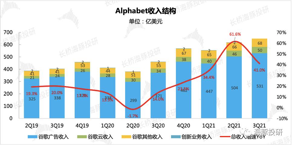 首先纵观Alphabet的整体业绩。二季度公司实现总营收651亿,同比增长41%,远超市场预期的37%。