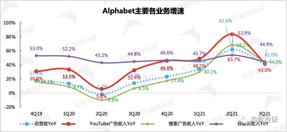 而YouTube广告有点掉队,在全球视频化趋势下,原本市场期望YouTube有望继续延续二季度的高光,达到50%左右的增长。并且上季度末还发布了短视频平台YouTube Shorts,应该也能带动一波热度。但从最终结果来看,略微失望。