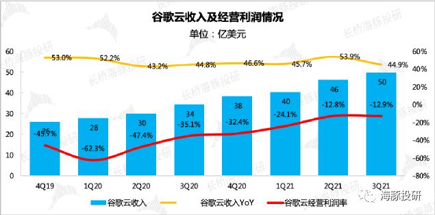这次谷歌云的经营表现有点略低于市场预期。收入增长45%,单季收入接近50亿,市场预期增长46%。