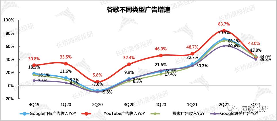 谷歌各类型广告三季度表现仍然全面强势,在去年高基数影响下,虽然增速环比放缓,但仍然表现出强大的增长韧性。