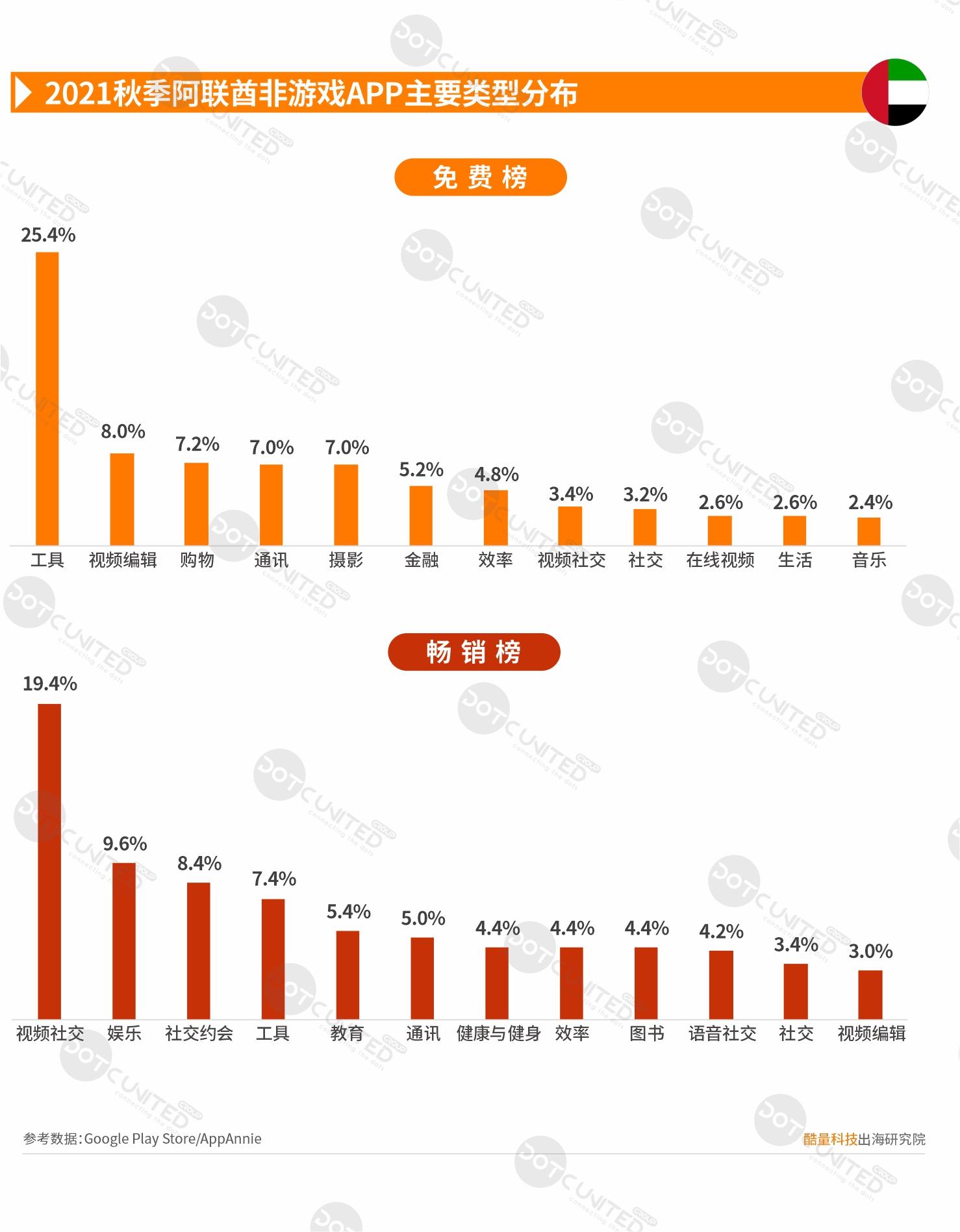 统计阿联酋非游戏应用Google Play Store TOP500显示,免费榜以工具类为主,占比约25%。畅销榜以视频社交类为主导,占比约19%,其次有娱乐、社交约会等类型。