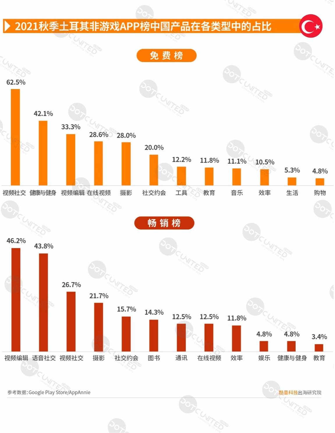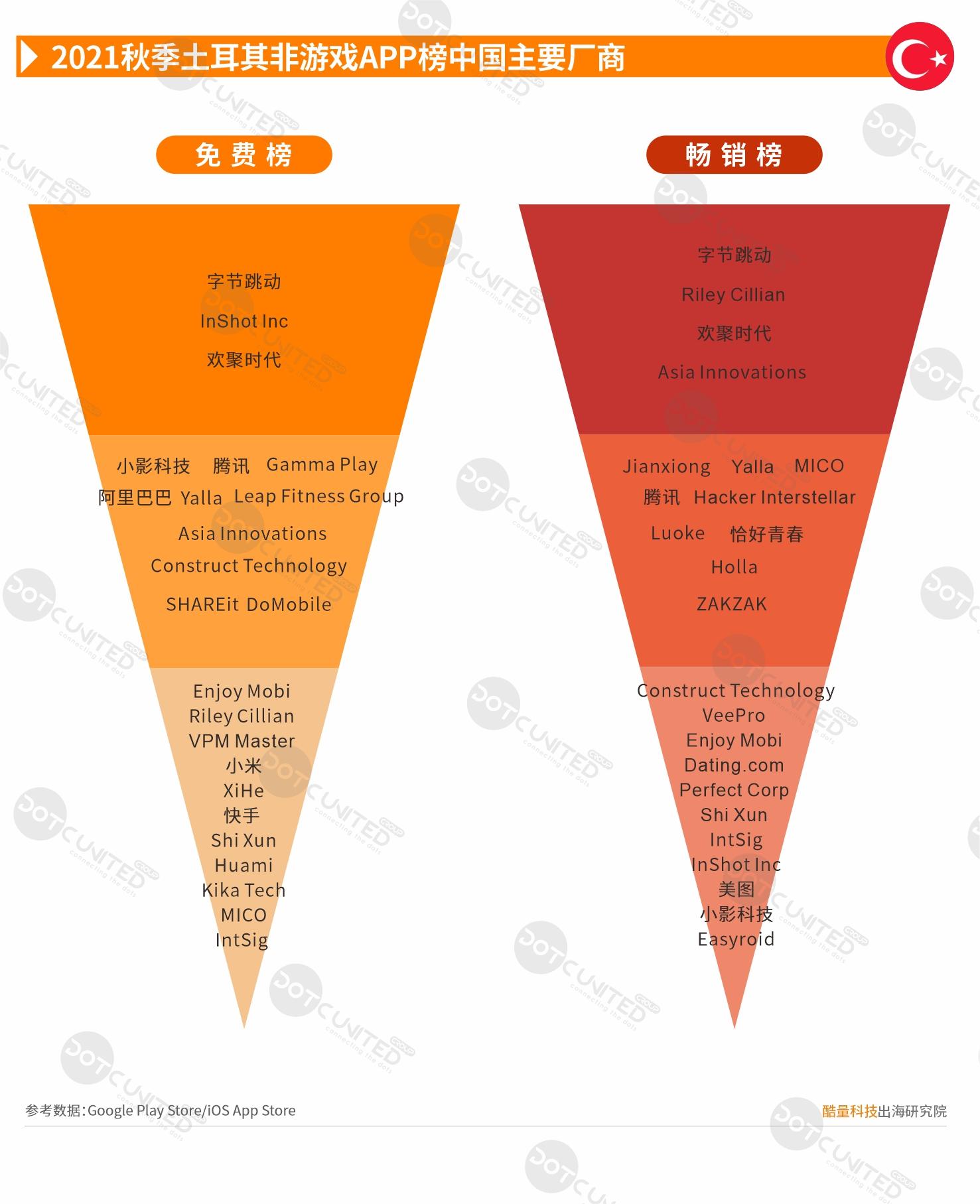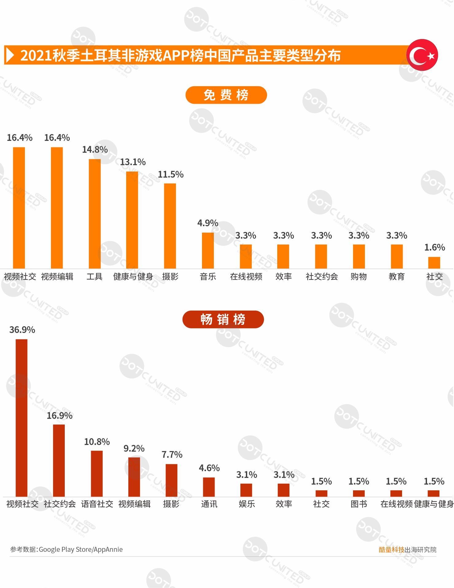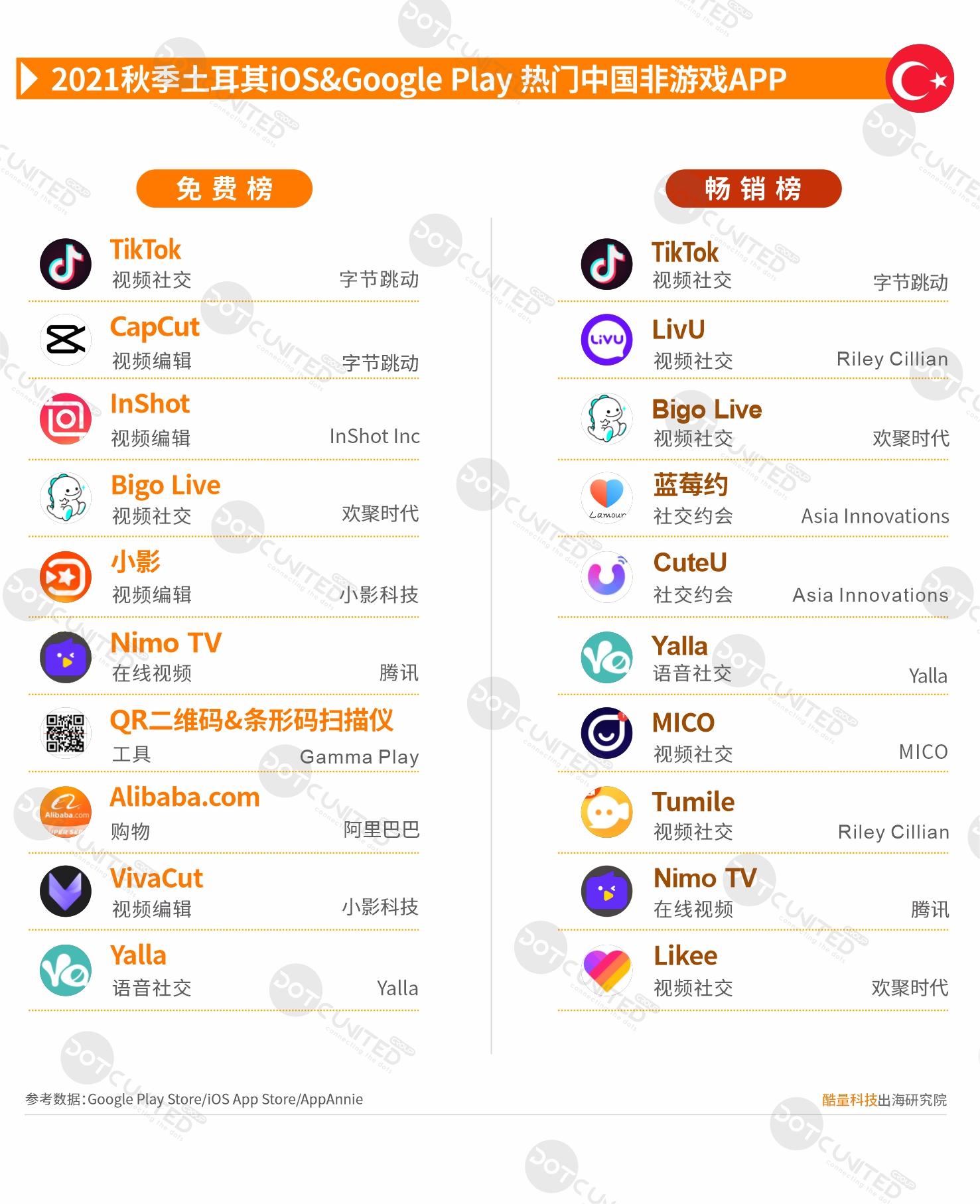 统计2021年7月~9月土耳其非游戏应用iOS &Google Play Store榜单显示,在所有来自中国的产品中,字节跳动旗下TikTok无悬念免费榜、畅销榜双榜夺冠。