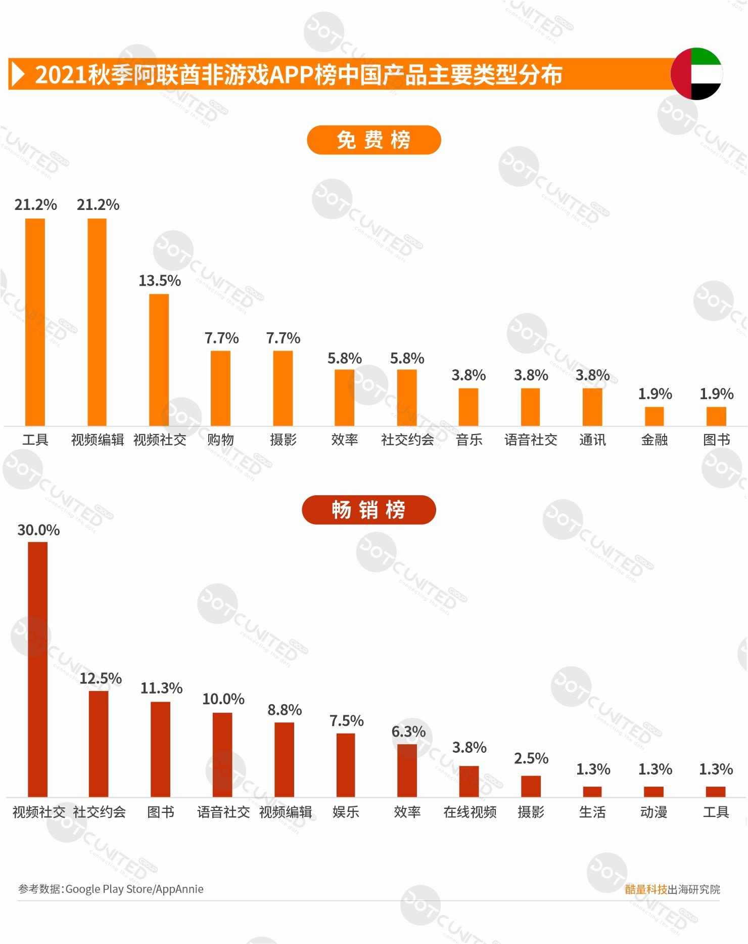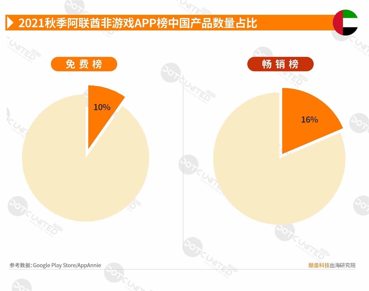 统计阿联酋非游戏应用Google Play Store TOP500显示,免费榜中,国内产品占约10%,畅销榜中占比16%。