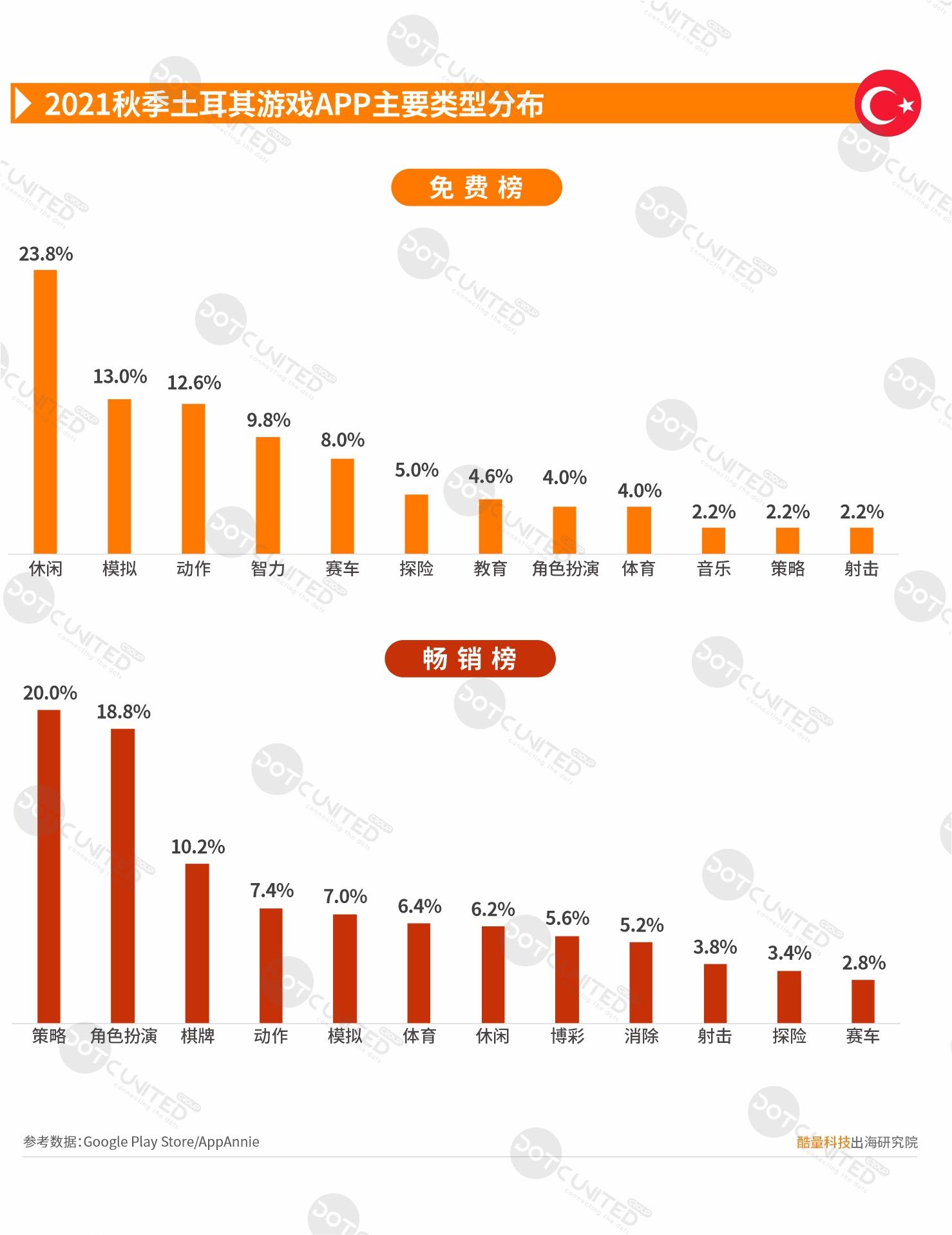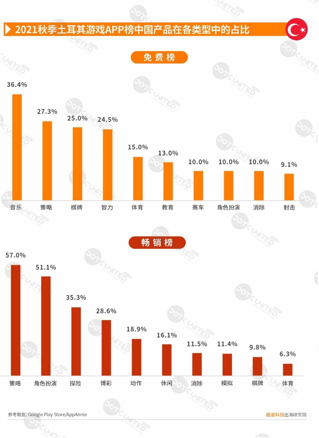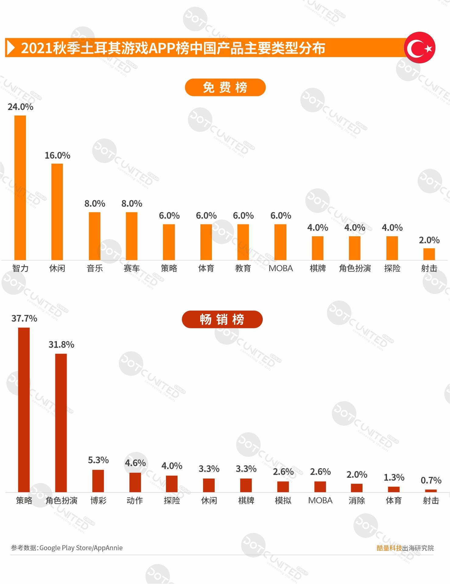 综上所述,目前中国出海土耳其市场的游戏类型以策略、角色扮演、智力和休闲类为主流。此外,音乐、赛车、博彩等类型也占有一席之地。