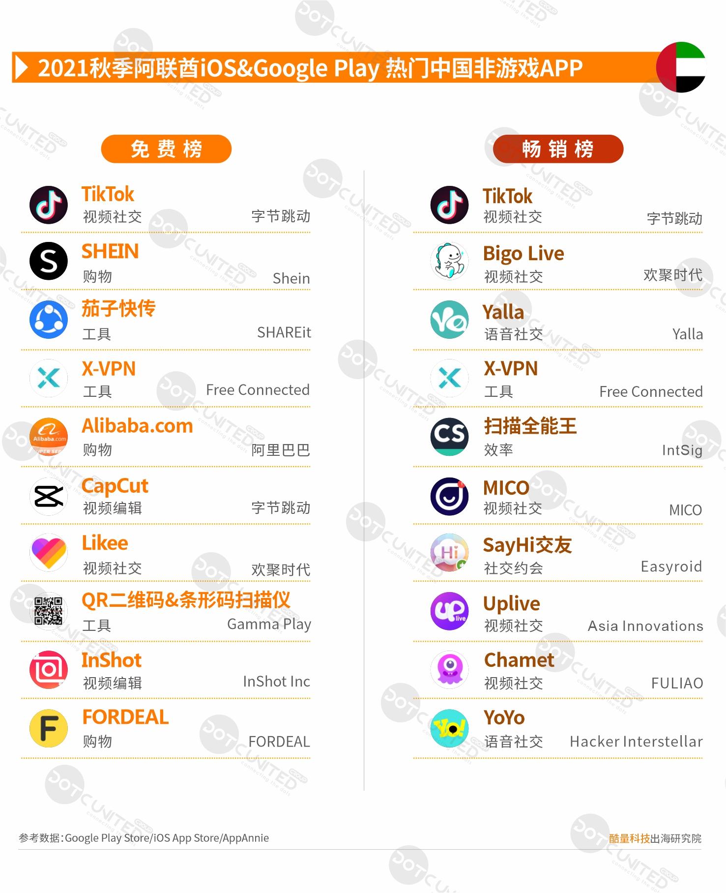 统计2021年7月~9月阿联酋非游戏应用iOS &Google Play Store榜单显示,在所有来自中国的产品中,字节跳动旗下TikTok雷打不动免费榜、畅销榜双榜夺冠。