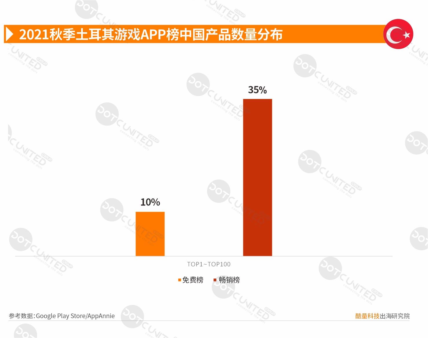 在TOP100的头部榜单中,免费榜上中国产品占比10%,畅销榜中占比35%,中国游戏在土耳其市场的吸金能力可窥一斑。