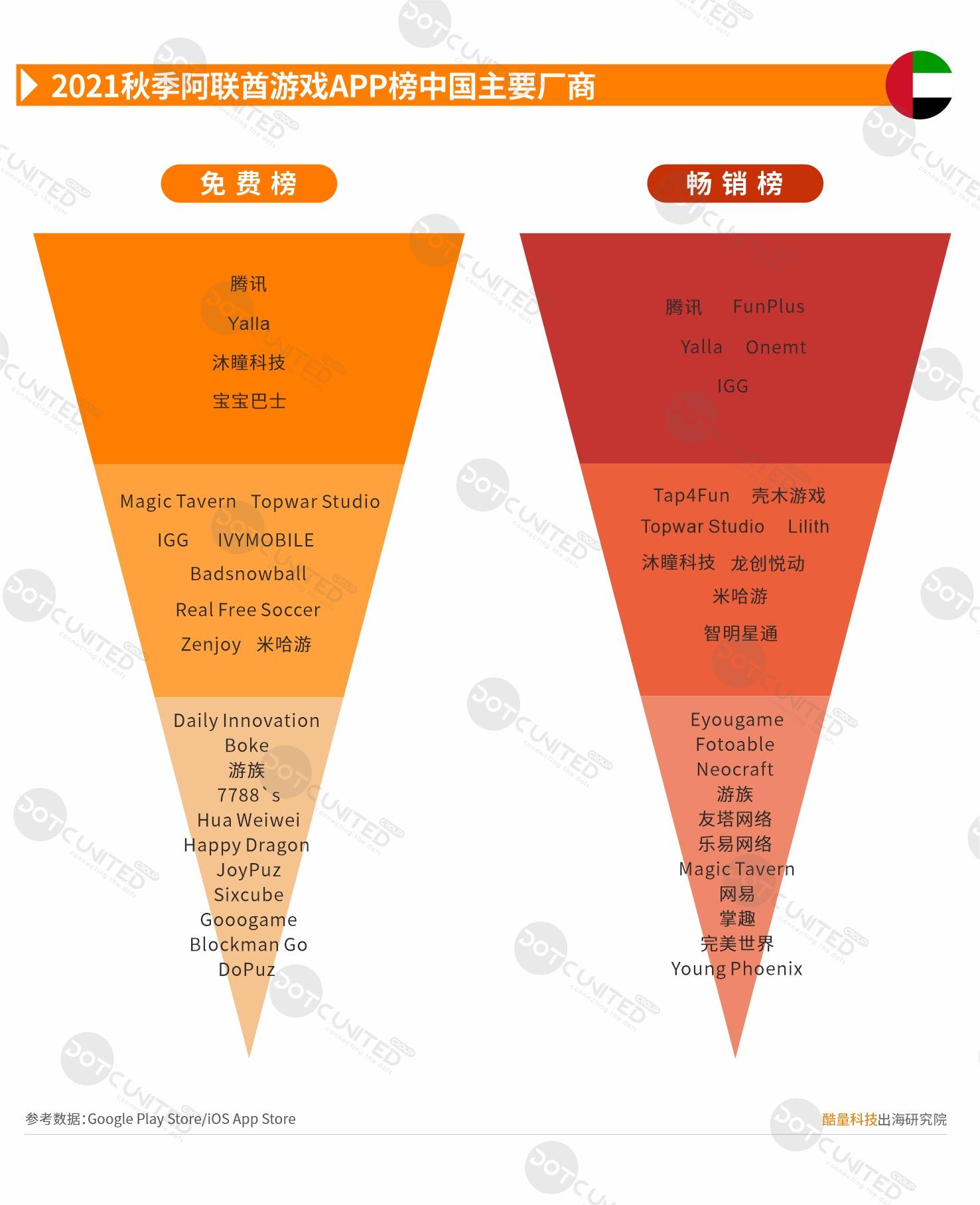 统计2021年7月~9月阿联酋游戏iOS &Google Play Store榜单显示,依然是腾讯凭借旗下《PUBG MOBILE》及其轻量版《PUBG MOBILE LITE》成为第三季度阿联酋市场下载量和收入最高的国内游戏公司。Yalla公司凭借旗下一枝独秀《Yalla Ludo》表现同样亮眼。此外,沐瞳科技(《无尽对决》)、Onemt(《苏丹的复仇》)、宝宝巴士(《宝宝巴士世界》)、IGG(《王国纪元》)等公司在阿联酋也都扎稳了脚跟。