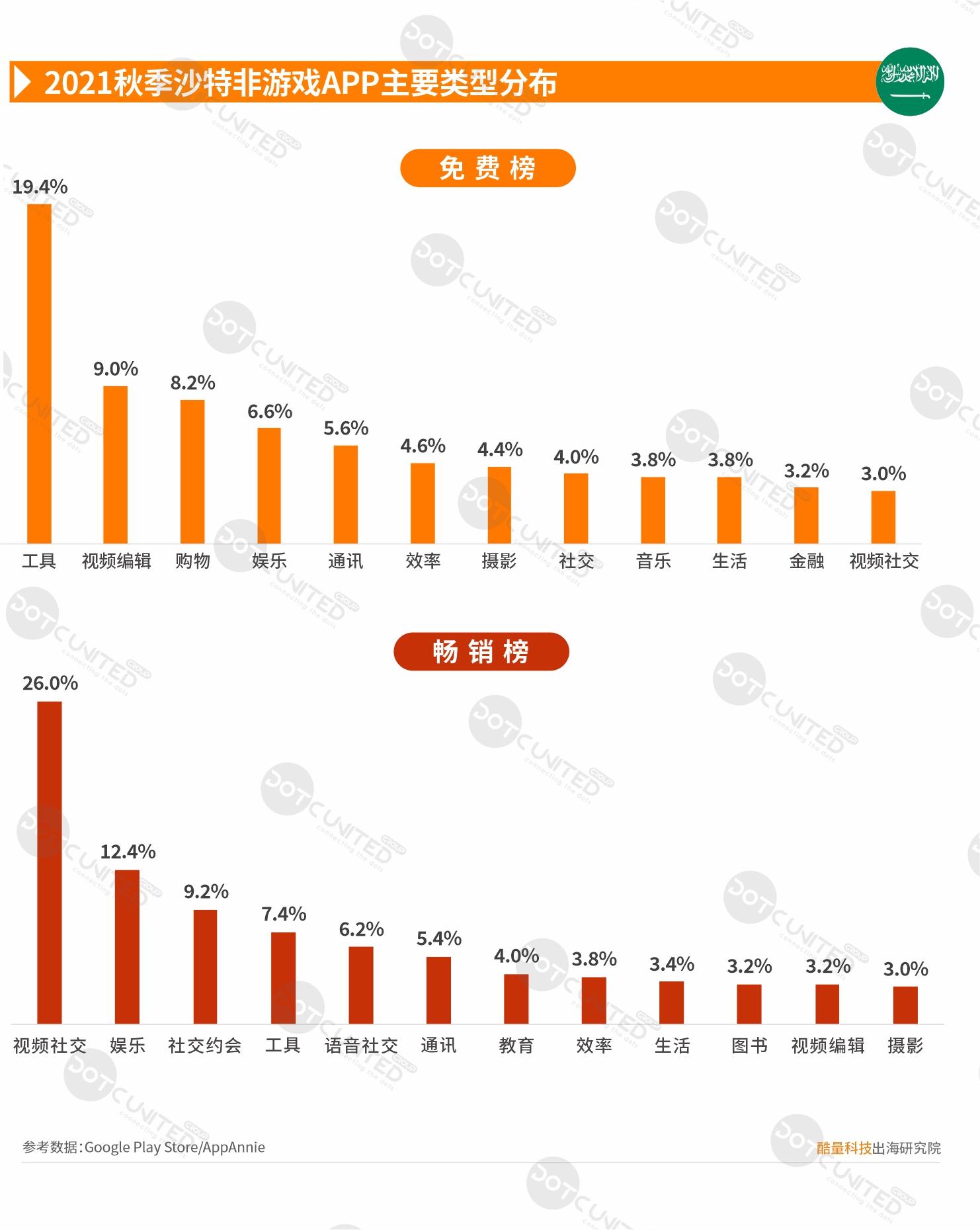 统计沙特非游戏应用Google Play Store TOP500显示,免费榜以工具类为主,占比约19%。畅销榜以视频社交类为主导,占比26%,其次有娱乐、社交约会等类型。