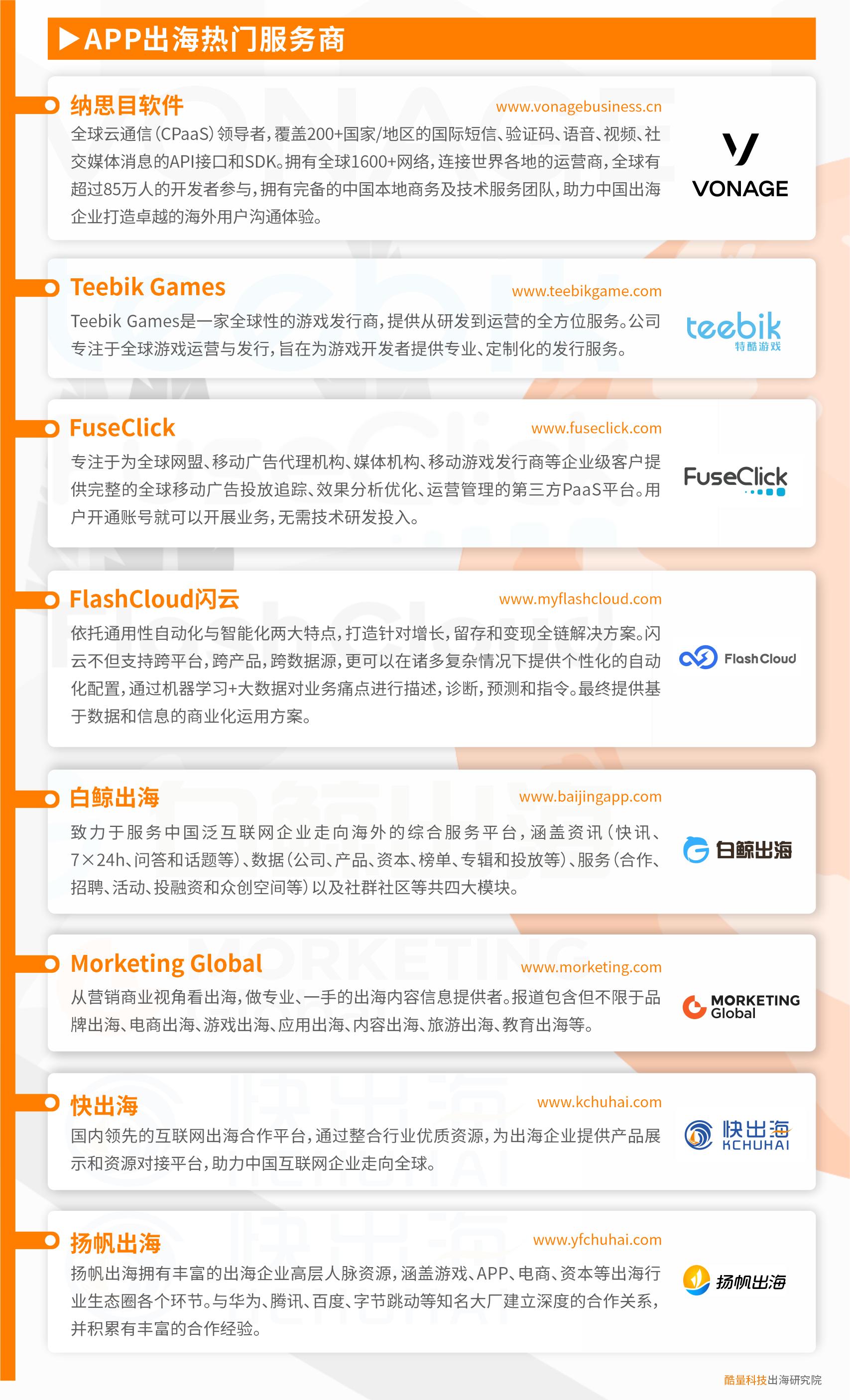 出海服务商在应用出海的环节中不可或缺,近年随着出海浪潮的涌起,整个出海产业链细枝末节上的各类服务商不断崛起。目前,国内APP出海各领域的服务商不胜枚举,如专注全球云通信技术的纳思目软件Vonage、提供从研发到运营的全方位服务的游戏公司Teebik Games、第三方PaaS平台FuseClick、提供高端个性化服务的FlashCloud闪云,以及互联网出海综合服务平台白鲸出海、Morketing、快出海、扬帆出海等企业,都在各自领域发光发热,助力中国移动互联网成功出海。