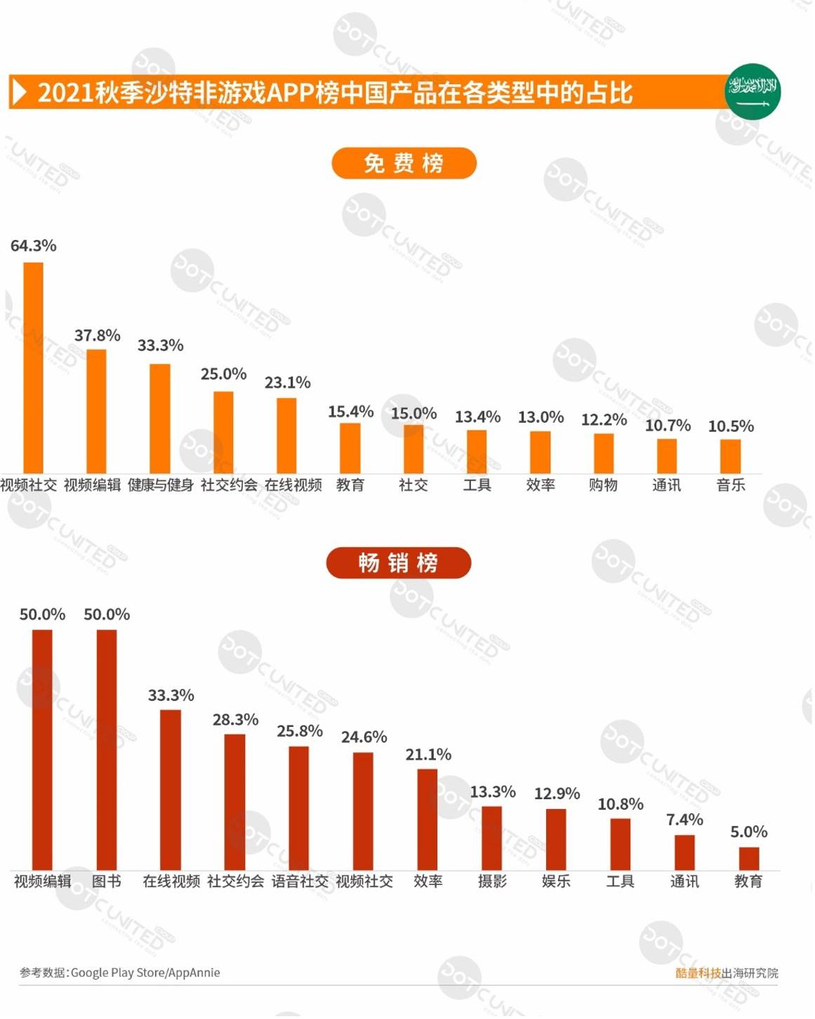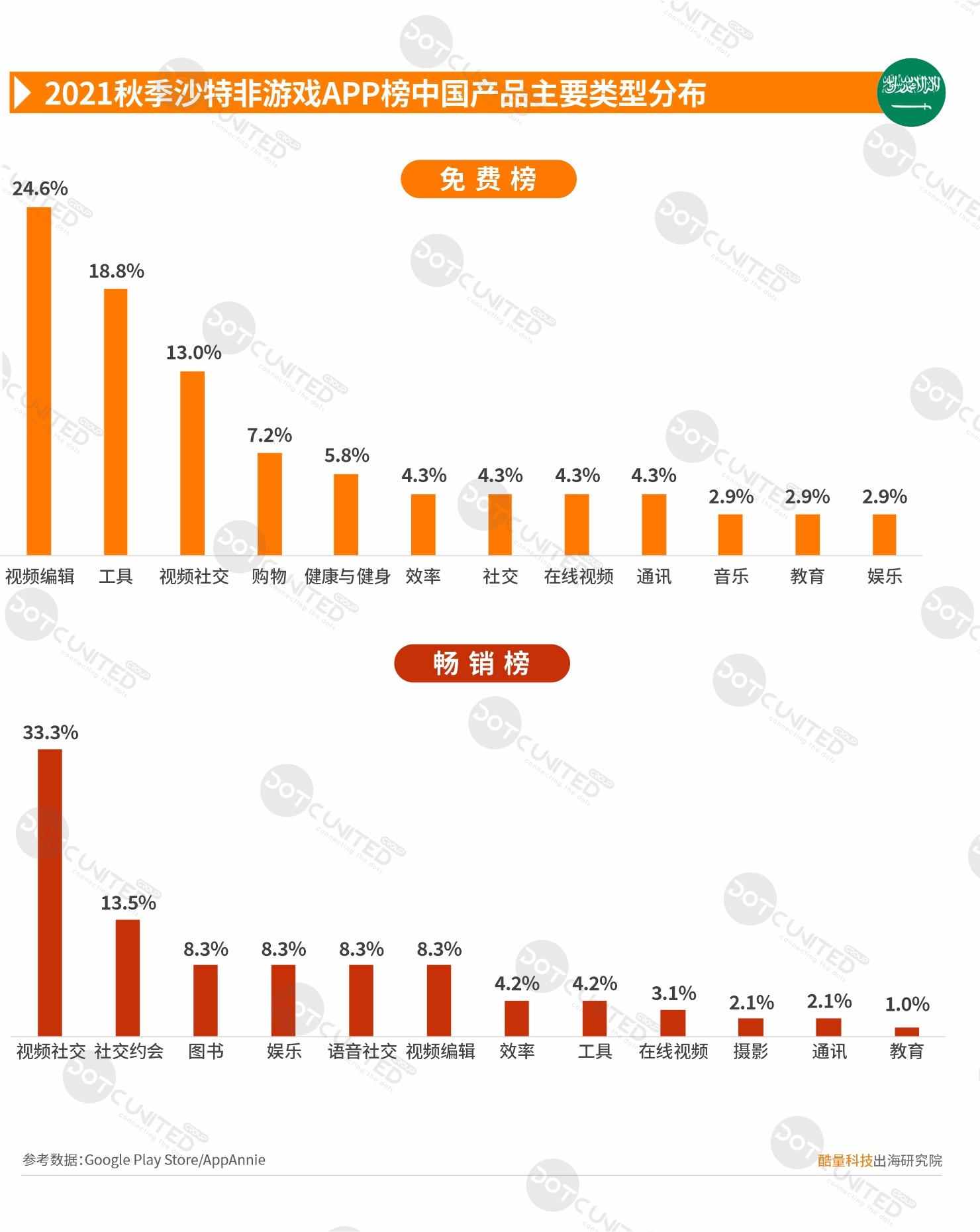 综上所述,目前沙特市场上的非游戏应用中,中国产品在视频社交、视频编辑和图书类中已经占据了主导性地位。对于健康与健身、在线视频、社交约会类,未来仍有扩张空间。