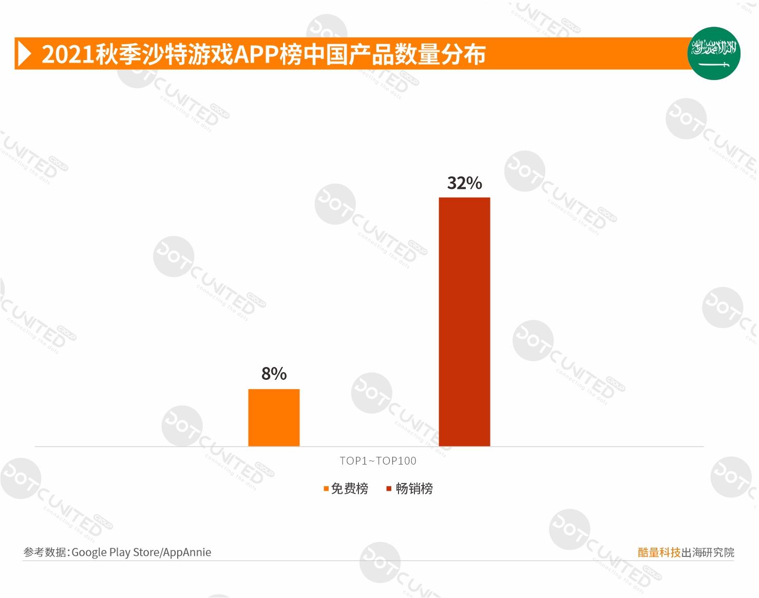 在TOP100的头部榜单中,免费榜上中国产品占比8%,畅销榜中占比32%,同土耳其市场基本相似,在沙特畅销榜头部列队中,来自国内的游戏数量占比超过三分之一。