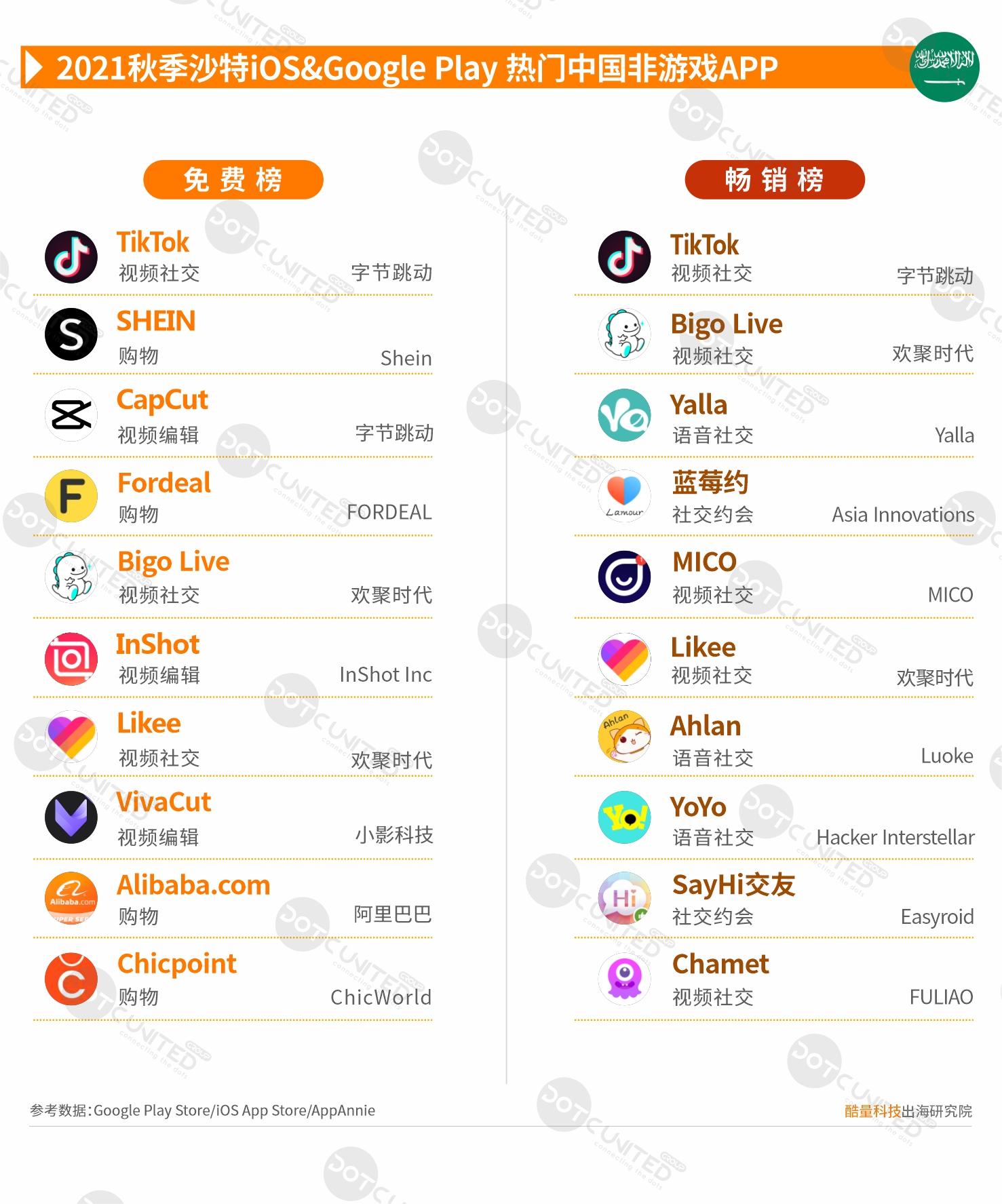 统计2021年7月~9月沙特非游戏应用iOS &Google Play Store榜单显示,在所有来自中国的产品中,依然是字节跳动旗下TikTok免费榜、畅销榜双榜夺冠。