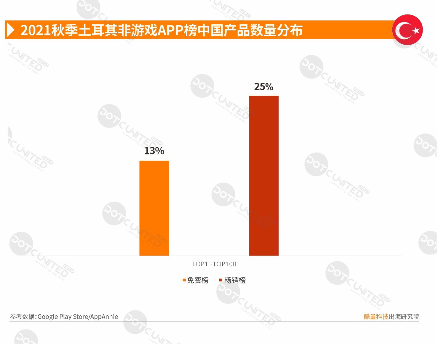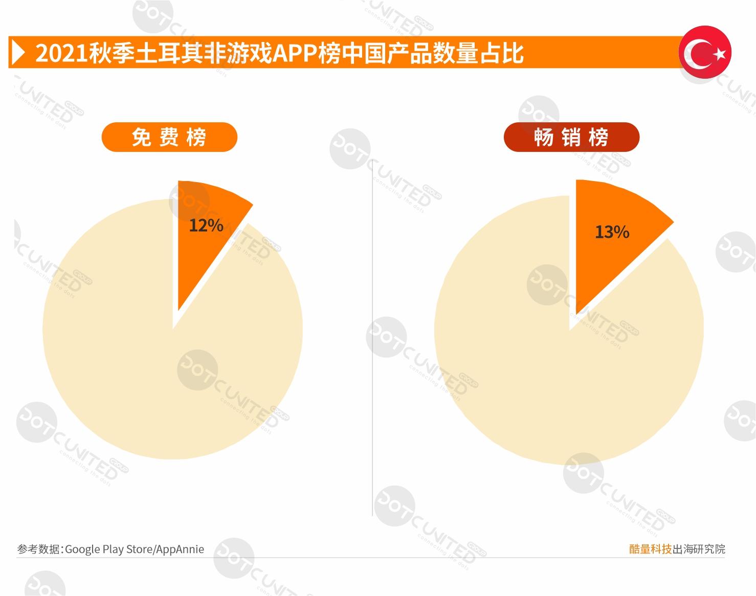 统计土耳其非游戏应用榜Google Play Store TOP500显示,免费榜中,国内产品占约12%,畅销榜中占比13%。