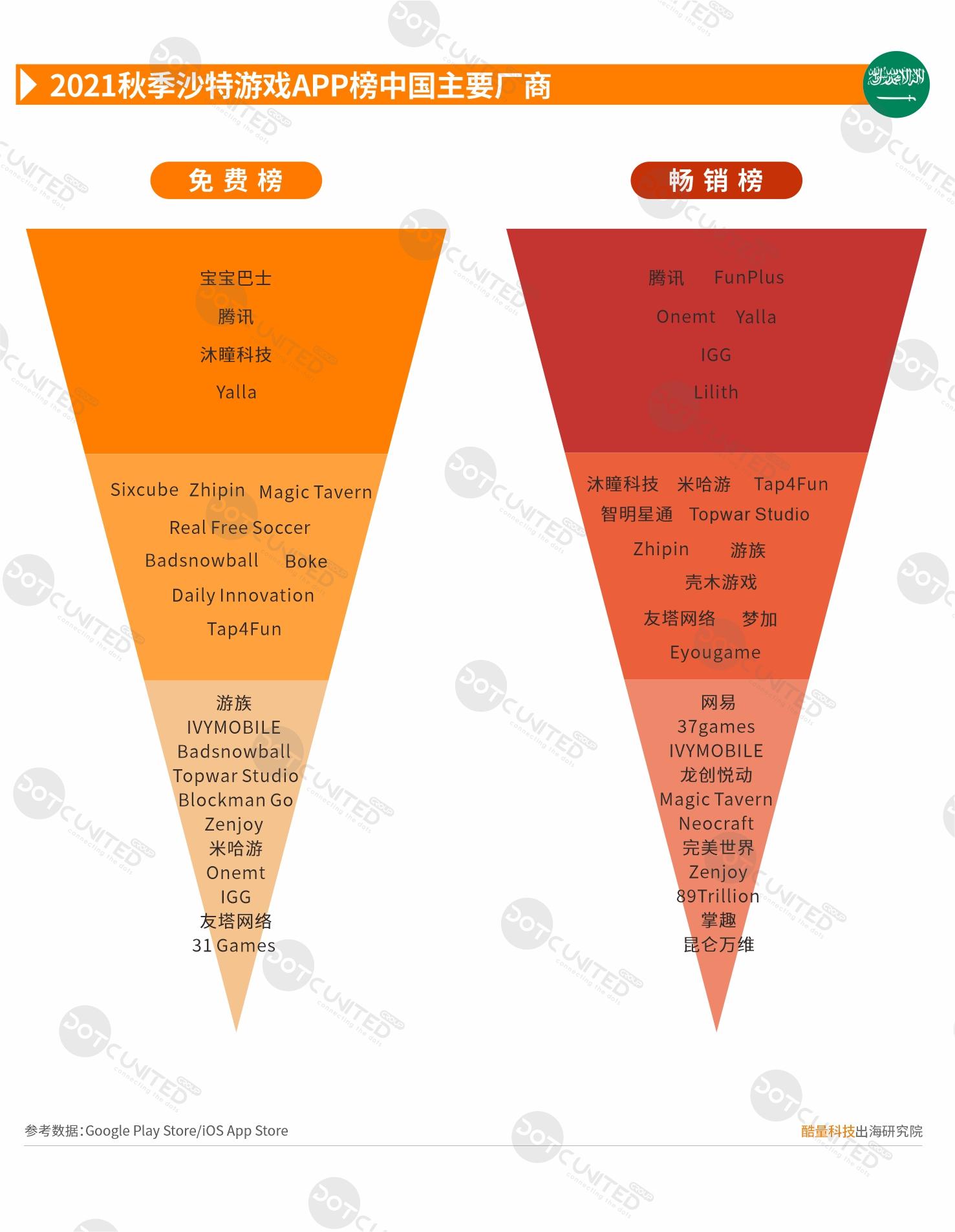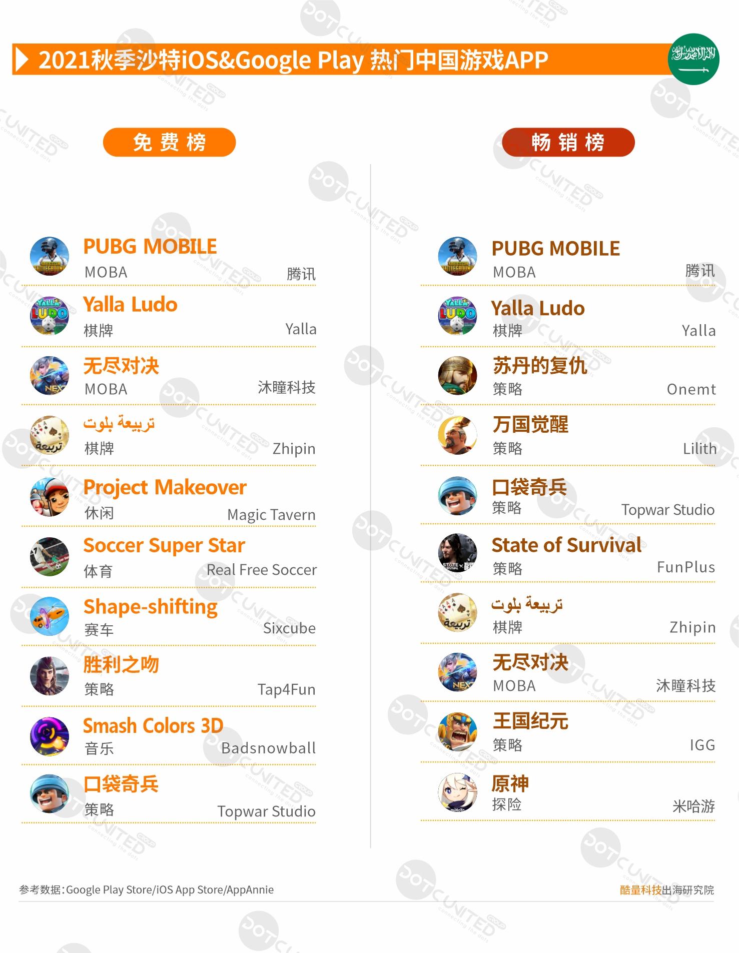 统计2021年7月~9月沙特游戏iOS &Google Play Store榜单显示,在所有来自中国的游戏中,依然是腾讯旗下《PUBG MOBILE》免费榜和畅销榜双榜夺冠。专注语音社交的Yalla公司旗下棋牌社交游戏《Yalla Ludo》在一众热门产品中脱颖而出,位居免费畅销双榜第二。