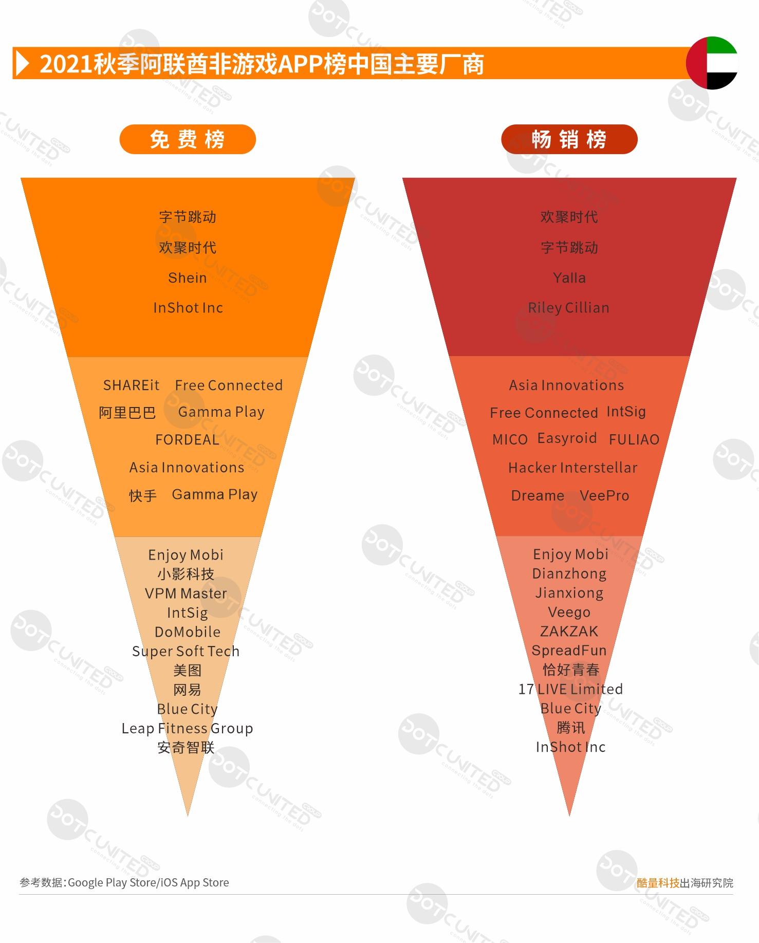 统计2021年7月~9月阿联酋非游戏应用iOS &Google Play Store榜单显示,字节跳动凭借TikTok及其轻量版TikTok Lite和剪映海外版CapCut等,欢聚时代凭借BIGO LIVE、Likee、Biugo等多款产品,无悬念成为了第三季度中国厂商出海阿联酋市场的双王牌。