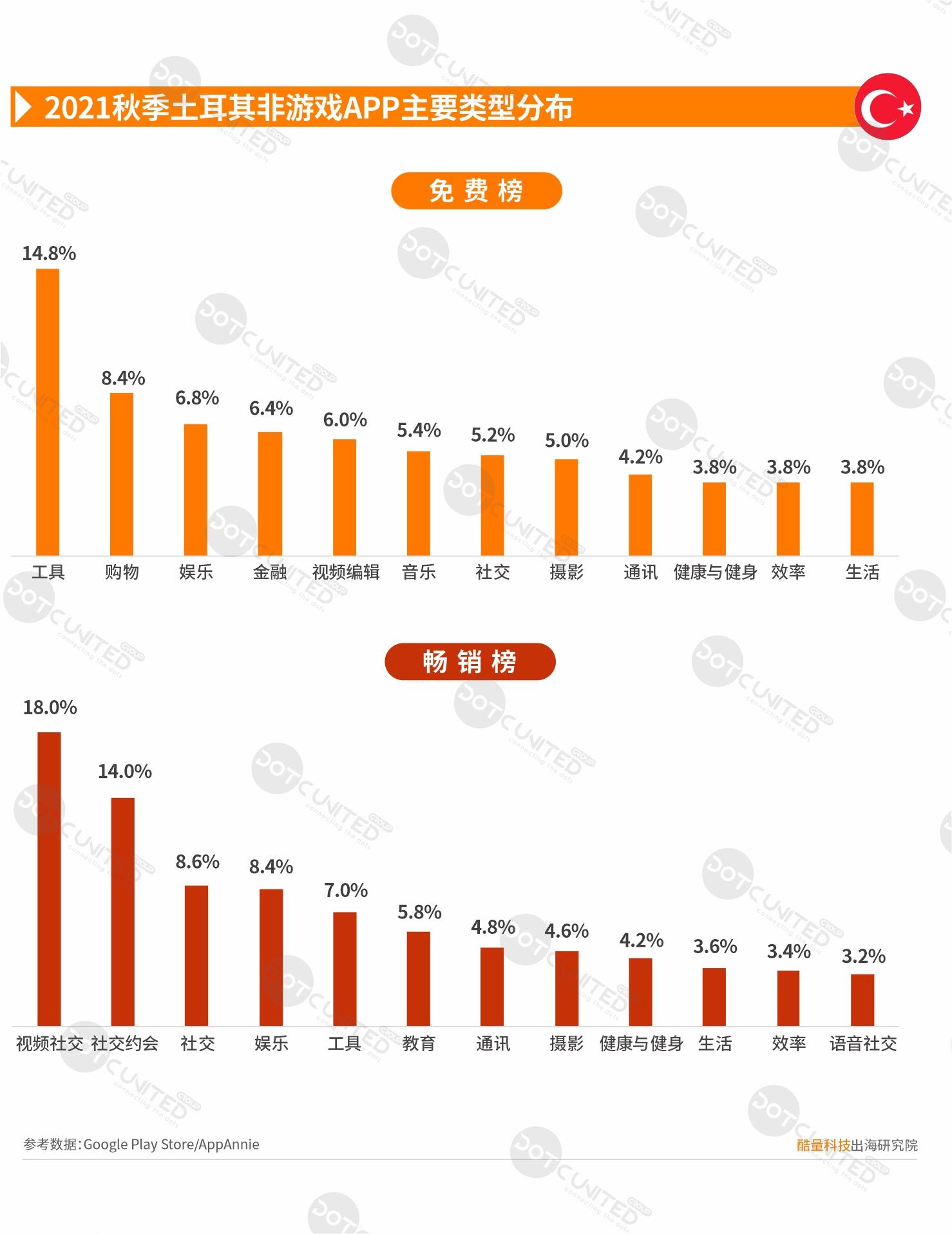 统计土耳其非游戏应用Google Play Store TOP500显示,免费榜以主流的工具类为主,占比约15%。畅销榜以视频社交和社交约会类为主导,其次有社交、娱乐等类型。