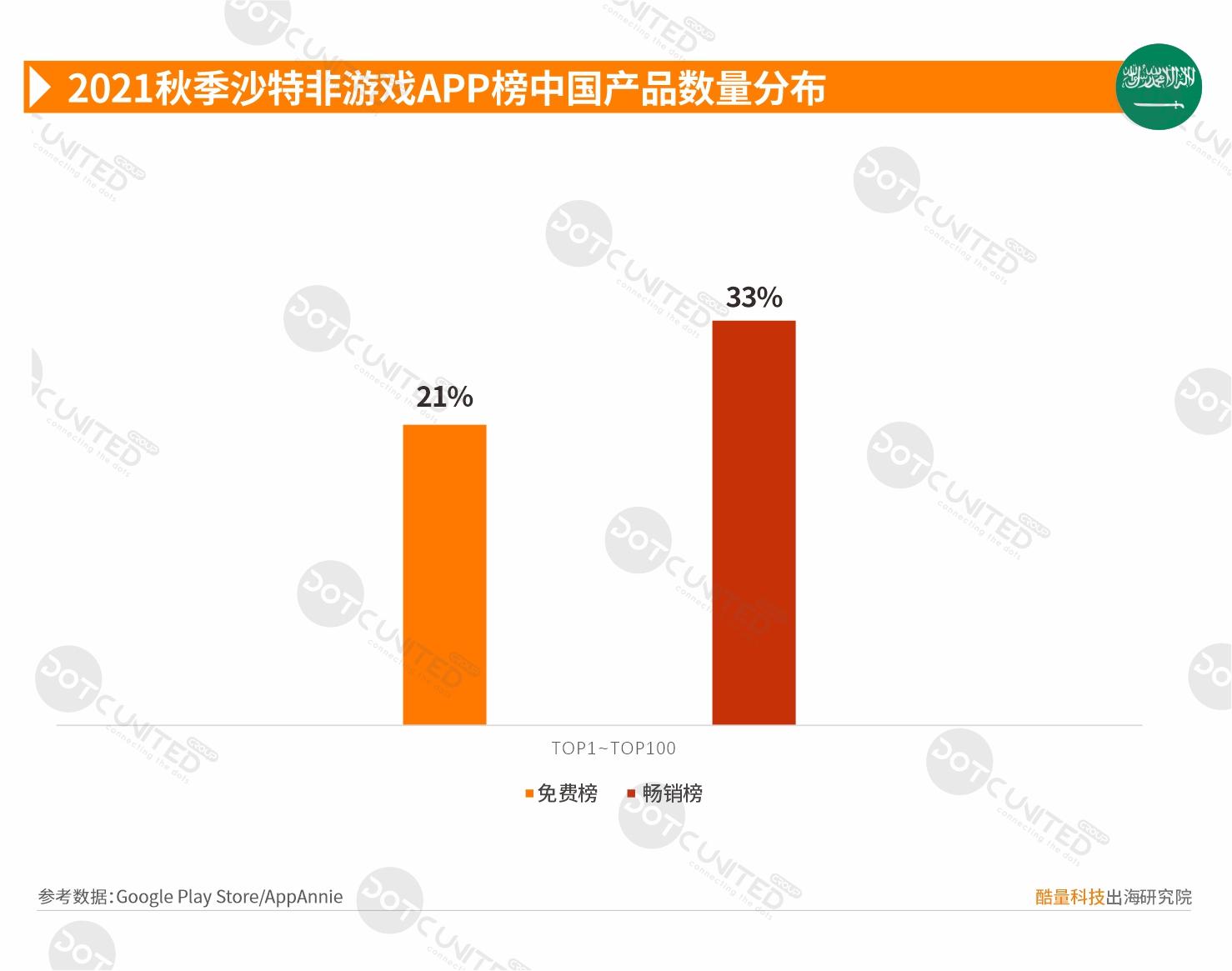 统计沙特非游戏应用Google Play Store TOP500显示,免费榜中,国内产品占约14%,畅销榜中占比19%。