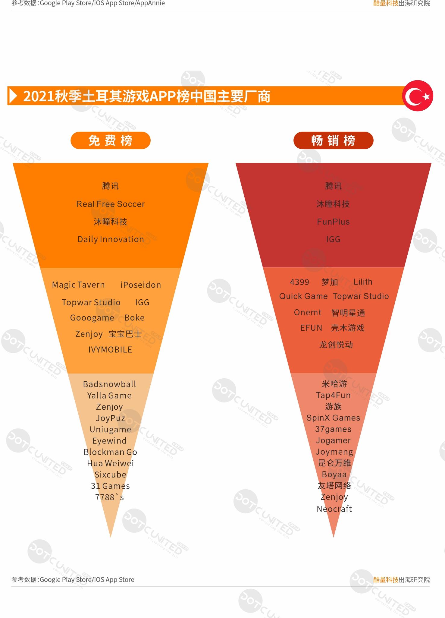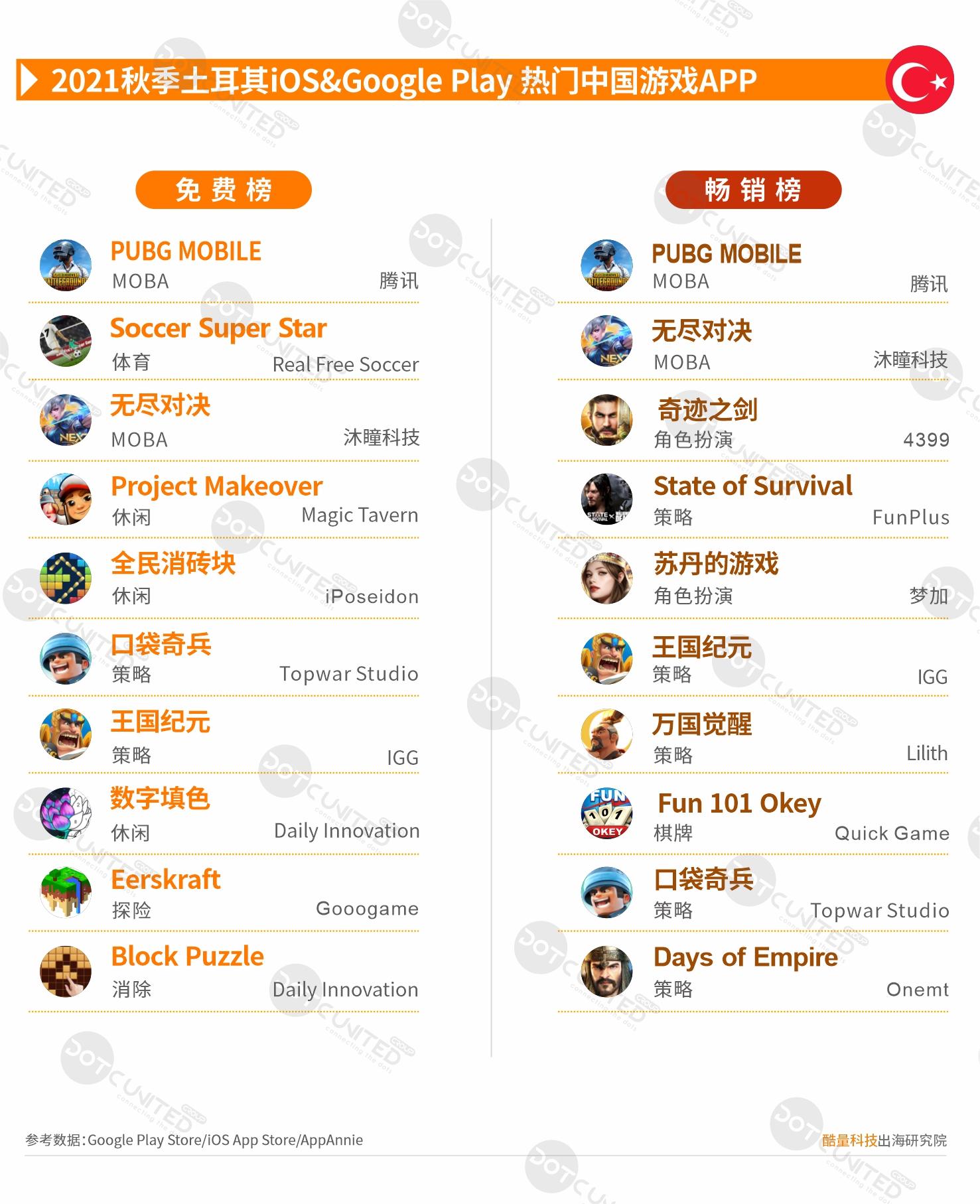统计2021年7月~9月土耳其游戏iOS &Google Play Store榜单显示,在所有来自中国游戏中,腾讯的《PUBG MOBILE》免费榜和畅销榜双榜夺冠,沐瞳科技旗下《无尽对决》双榜跻身前三。此外,足球游戏《Soccer Super Star》位居免费榜第二、4399旗下《奇迹之剑》位居畅销榜第三,是第三季度土耳其市场上最赚钱的角色扮演类游戏。