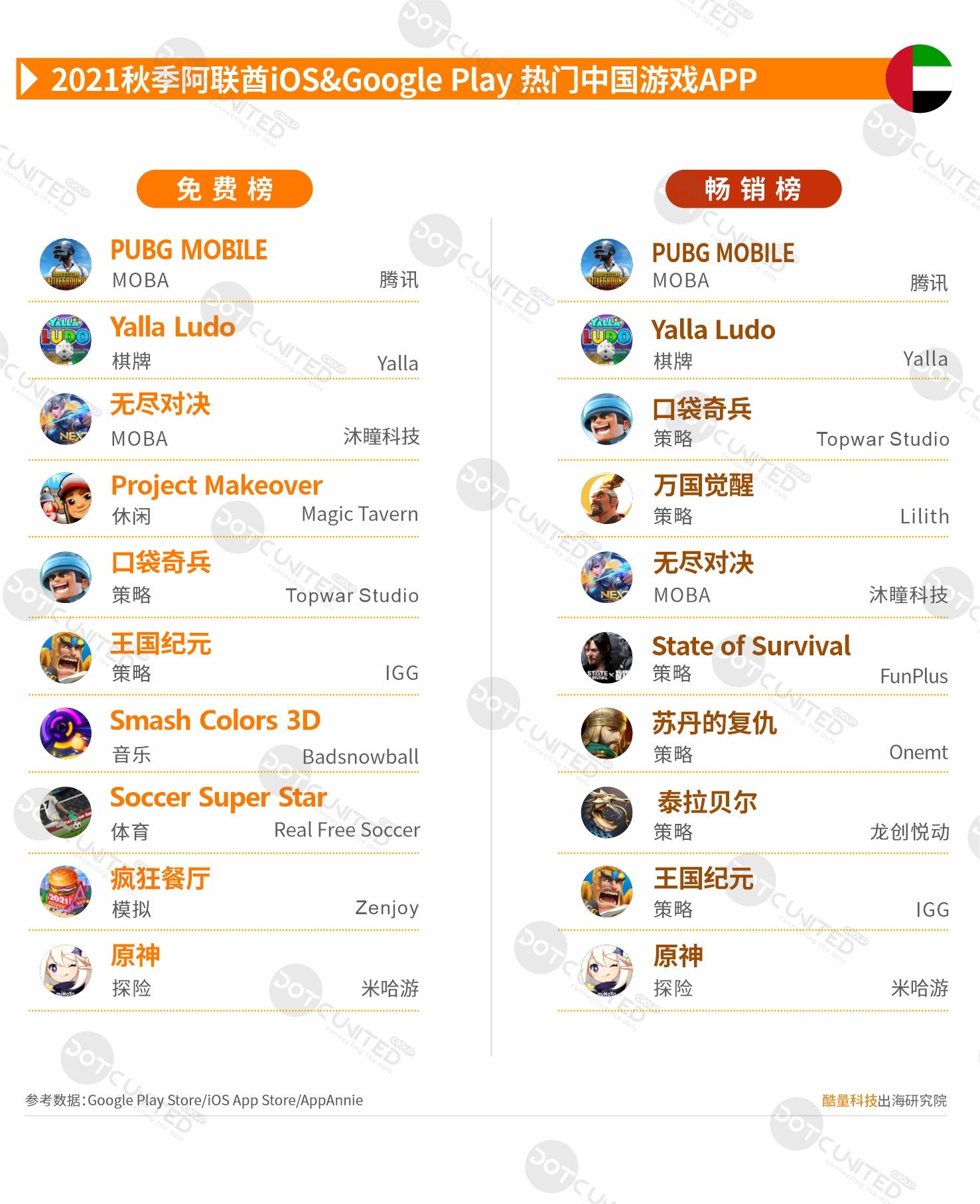 统计2021年7月~9月阿联酋游戏iOS &Google Play Store榜单显示,同沙特市场一样,在所有来自中国游戏中,腾讯旗下《PUBG MOBILE》和Yalla旗下《Yalla Ludo》分别稳坐免费榜、畅销榜冠亚军宝座。