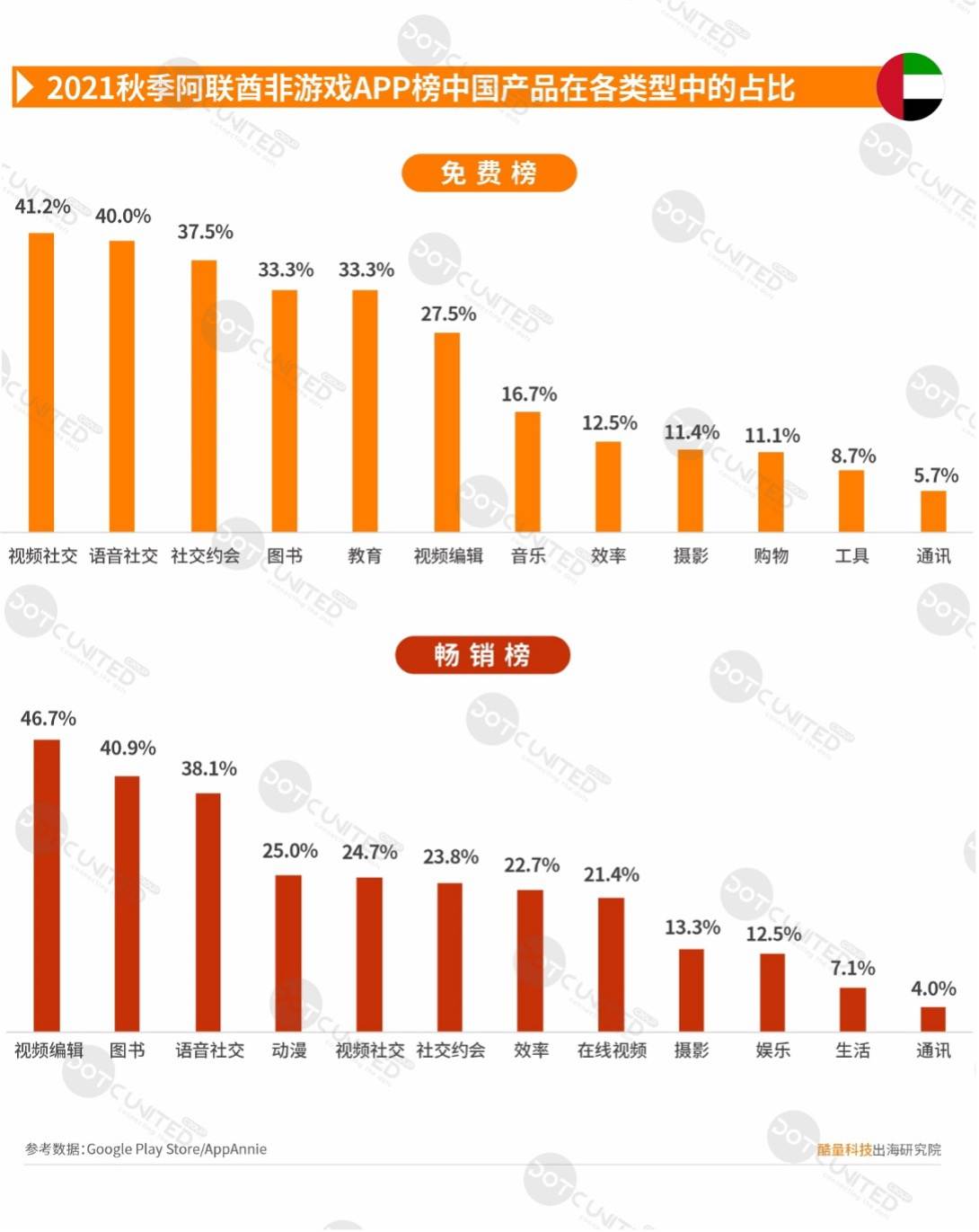 整体来看,目前阿联酋市场上的非游戏应用中,中国产品在视频社交、视频编辑、语音社交和图书类中都占据着主导地位。此外,教育、社交约会、动漫等类型中,国内产品也占据着主要的市场份额。