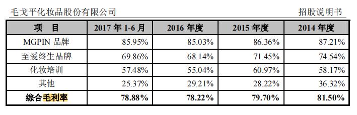 招股书显示,2014年至2017年上半年,毛戈平公司的综合毛利率分别为81.50%、79.70%、78.22%和78.88%。