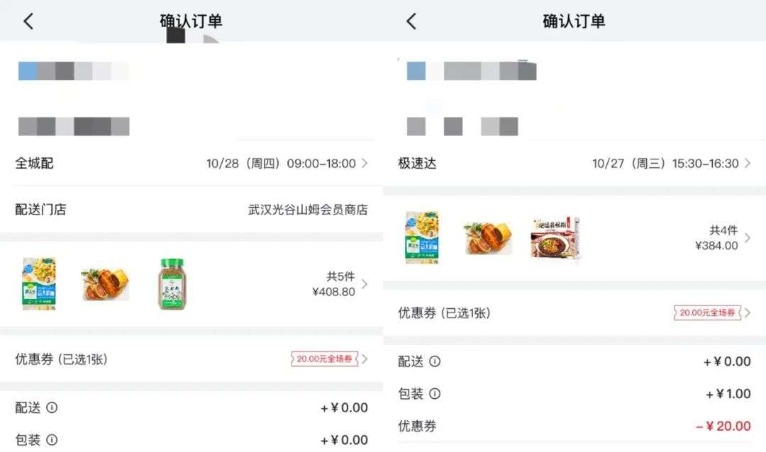 山姆的全城送和极速达两种配送模式,图源山姆手机APP截图