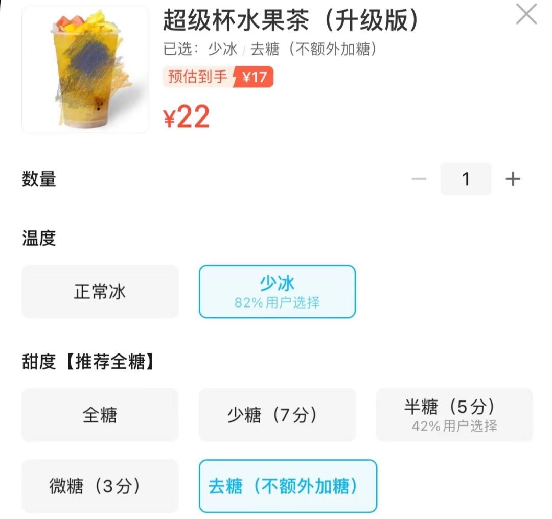 所以水果茶就算点“不额外加糖”也会觉得很甜 | 截图来自某奶茶店外卖平台