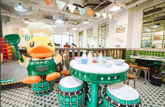 门店遍布小黄鸭装饰元素,还可与“火锅炒料大师”小黄鸭合影,满足打卡消费需求;