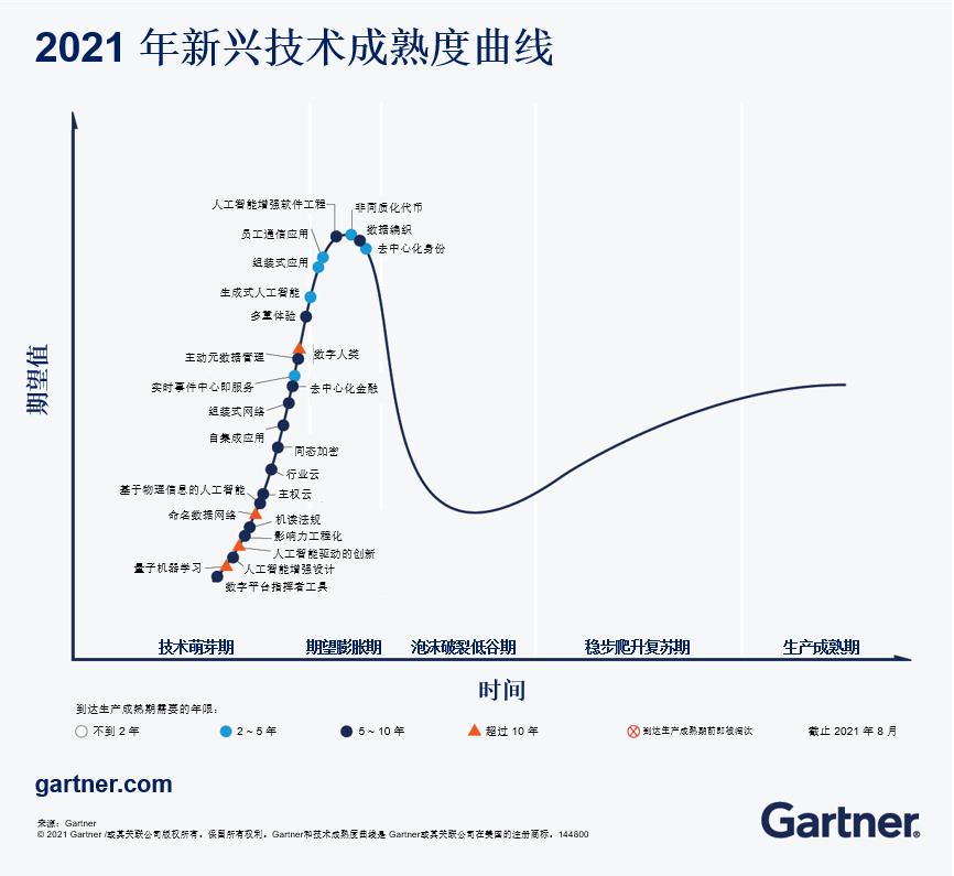 自1995年起,高德纳咨询公司根据其专业分析预测、推论各种新科技的成熟演变速度以及成熟所需的时间,并用“技术成熟度曲线”来体现各类技术的生命周期,周期大致分成5个阶段。