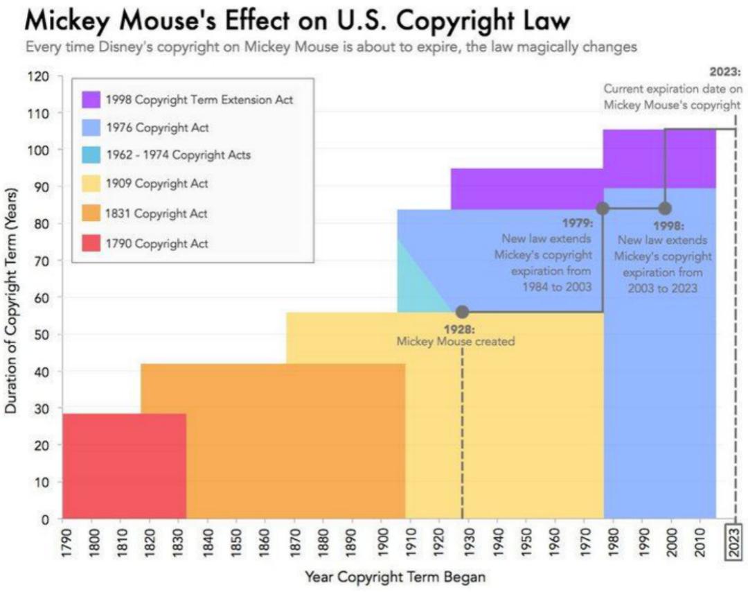 在 1976 年和 1997 年,迪士尼和其它企业成功说服美国政府两次调整相关法案,将对版权的保护期延到 95 年。