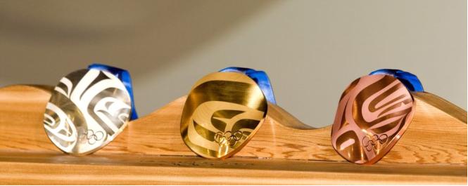 △2010年温哥华冬奥会奖牌。奖牌表面设计为起伏状而不是平面,给人以加拿大常见的海浪、飞雪与山峦自然景观的联想。正面激光镌刻的背景图案截取自加拿大原住民设计师考琳·亨特创作的两幅具有浓郁民族特色的抽象画,由于每块奖牌上截取的原画都不相同,每块奖牌都是独一无二的。