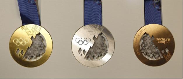 △2014年索契冬奥会奖牌。奖牌半边为金属实心部分,半边为银白色的镂空镶嵌设计。表现金色的阳光透过雪山之巅折射到黑海之滨的沙滩上,细节丰富精致。