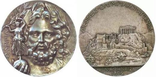 1986年第一届雅典奥运会 奖牌,正面图案为希腊神话中主宰宇宙的主神宙斯手中托着地球,胜利女神立于地球之上,并刻有希腊语“奥林匹克”。背面图案则是雅典卫城遗址。此奖牌的设计理念和元素为后来的奥运会奖牌设计奠定了基调。