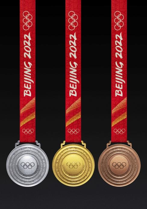 奖牌正面五环同心圆象征奥林匹克精神成为世界凝聚力,又通过五环同心传达“天地合·人心同”的中华文化内涵。同心圆之间装饰以中国传统纹样中经典的祥云与冰裂梅花,并将梅花改为雪花以契合冬奥会主题。冰裂雪花的设计也在桑蚕丝织的奖牌挂带上以暗纹形式延用,挂带浓郁的红色不仅是中国的代表色,也呼应冬奥举办时段正是热闹祥和的中国农历新年期间,向各国运动员传递新年祝福。