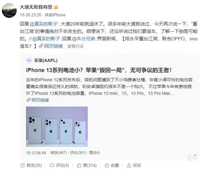 今天(10月27日),段永平本人在雪球表示:“‘重出江湖’的事情绝对不会发生的。顺便说下,还没听说过我们要造车,了解一下倒是可能的。”
