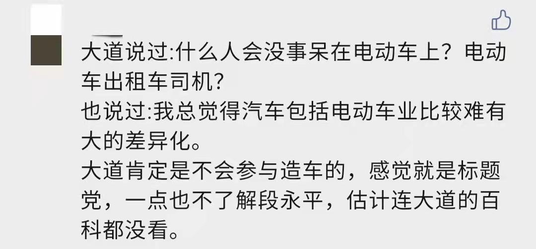 从这个角度来说,强烈希望段永平重出江湖的,无疑想看到他再次用他的理念在已成红海的造车江湖撕开一道口子,让这个行业有一些不同。
