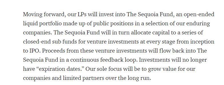 最重要的是,新的红杉基金,包括其子基金进行的一切投资,都将不再设定 回报期限。
