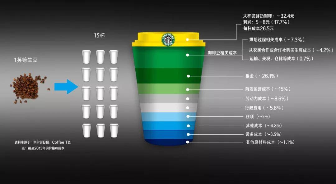 同时从《华尔街日报》披露的渣打银行统计的一杯星巴克咖啡的成本结构图来看,原材料成本在一杯大杯拿铁咖啡的成本构成中占比非常低,占据成本构成前两位的是租金成本和门店运营成本,分别高达26.1%和15%,而利润则为17.7%。