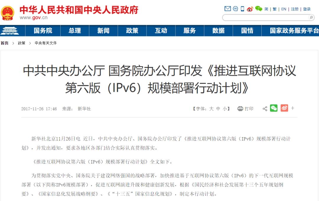 巨变的起始点同样是在2017年。当年11月,一份重要文件重磅出台,这就是中共中央办公厅、国务院办公厅印发的《推进互联网协议第六版(IPv6)规模部署行动计划》。