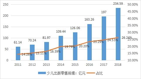 据开卷数据,2018年中国图书零售市场总规模为894亿元,其中占比26.24%的少儿图书市场规模达到234.59亿元。
