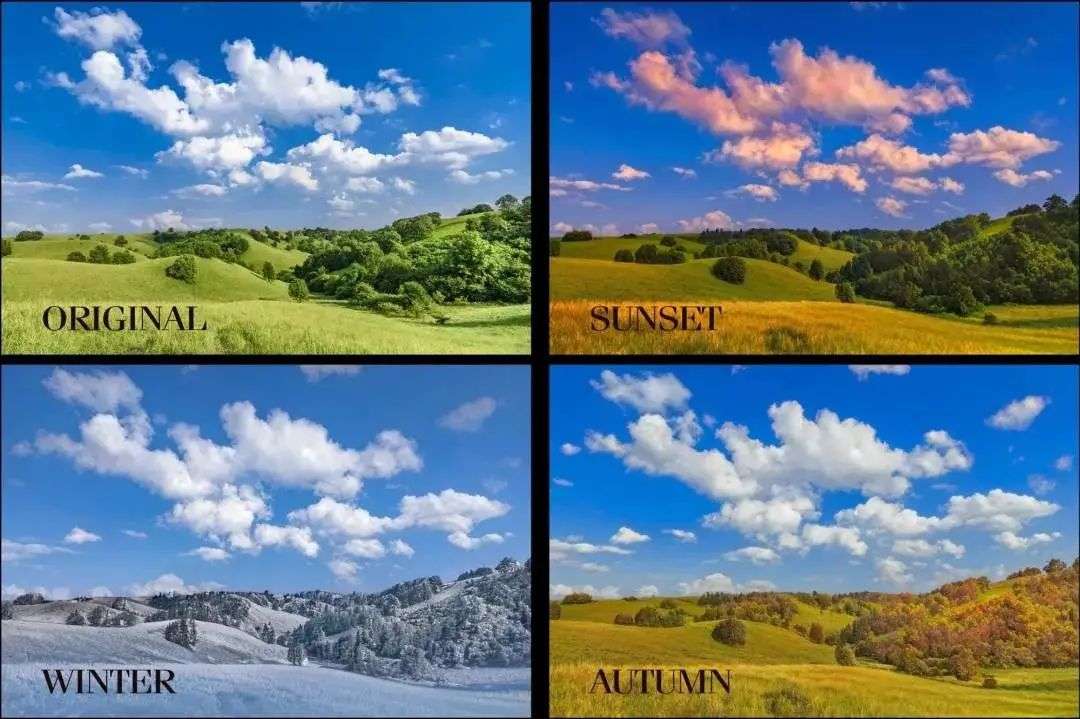 通过这个滤镜,你可以将两个不同季节的图像混合,让夏季场景变得像冬季场景,让早上的风景变成黄昏的模样。