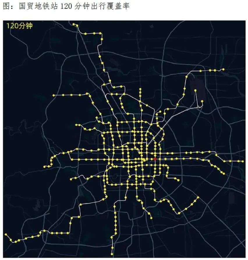 以国贸站点为例,我们测算了每隔10分钟的站点覆盖情况,可见,40分钟内,即可覆盖过半的地铁站点,120分钟即可覆盖全部站点。