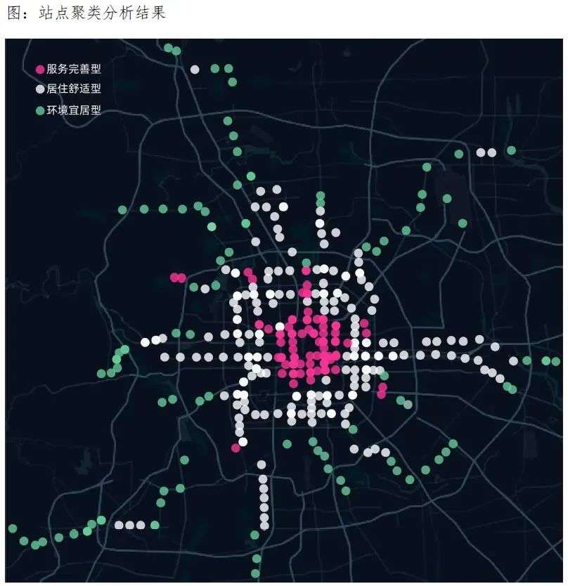 我们就从社区服务完善性、居住舒适性及环境宜居性三点出发,根据优先级,对地铁房进行了系统聚类分析,分成了三种:服务完善、居住舒适及环境宜居型,如图所示。