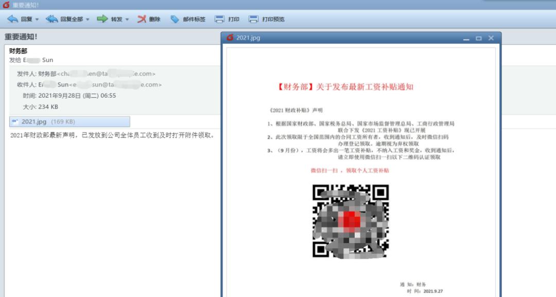 不法分子利用这个社会现象,伪装成公司财务部门,发送有关工资补贴的通知邮件。