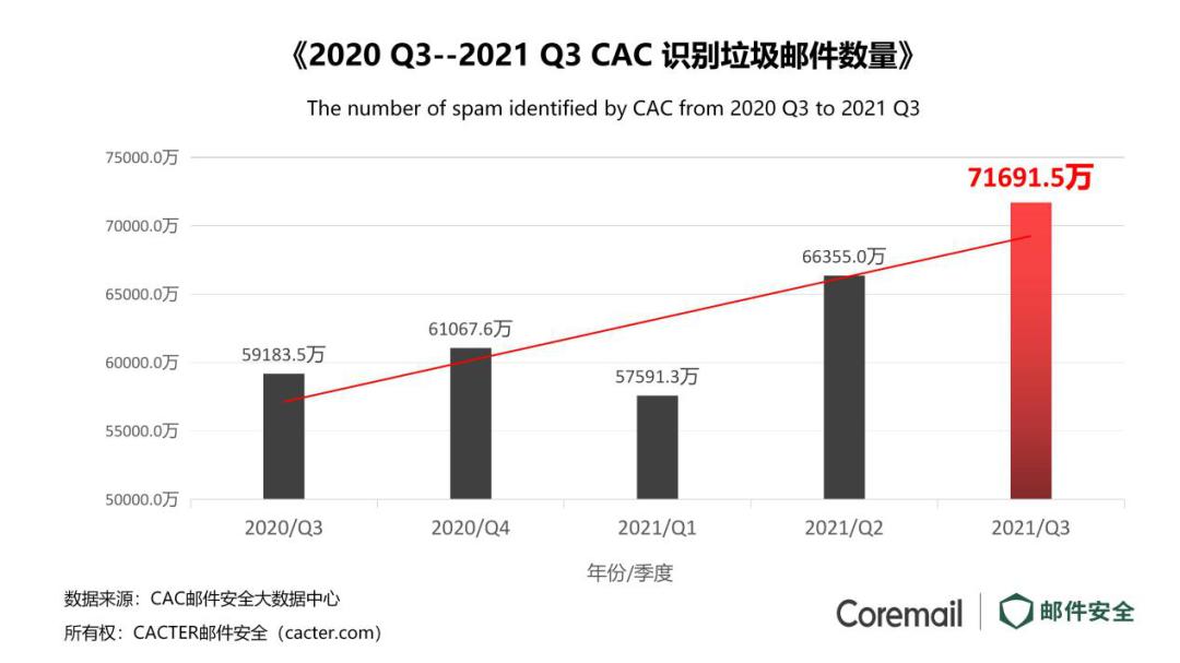 2021年第三季度整体垃圾邮件数量较Q2季度环比增长8.04%,同比去年同期增长21.13%。